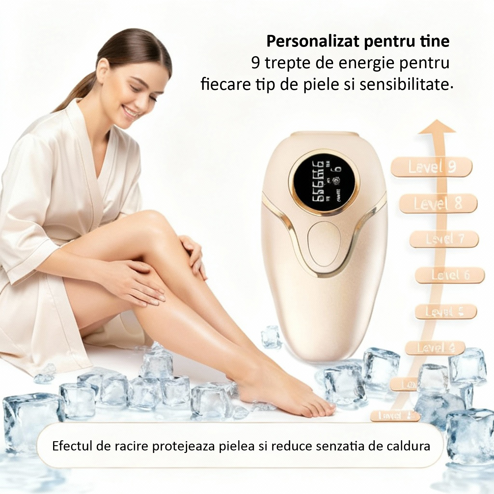 Dispozitivul are 9 niveluri de intensitate, astfel incat poate fi adaptat in functie de sensibilitatea pielii.