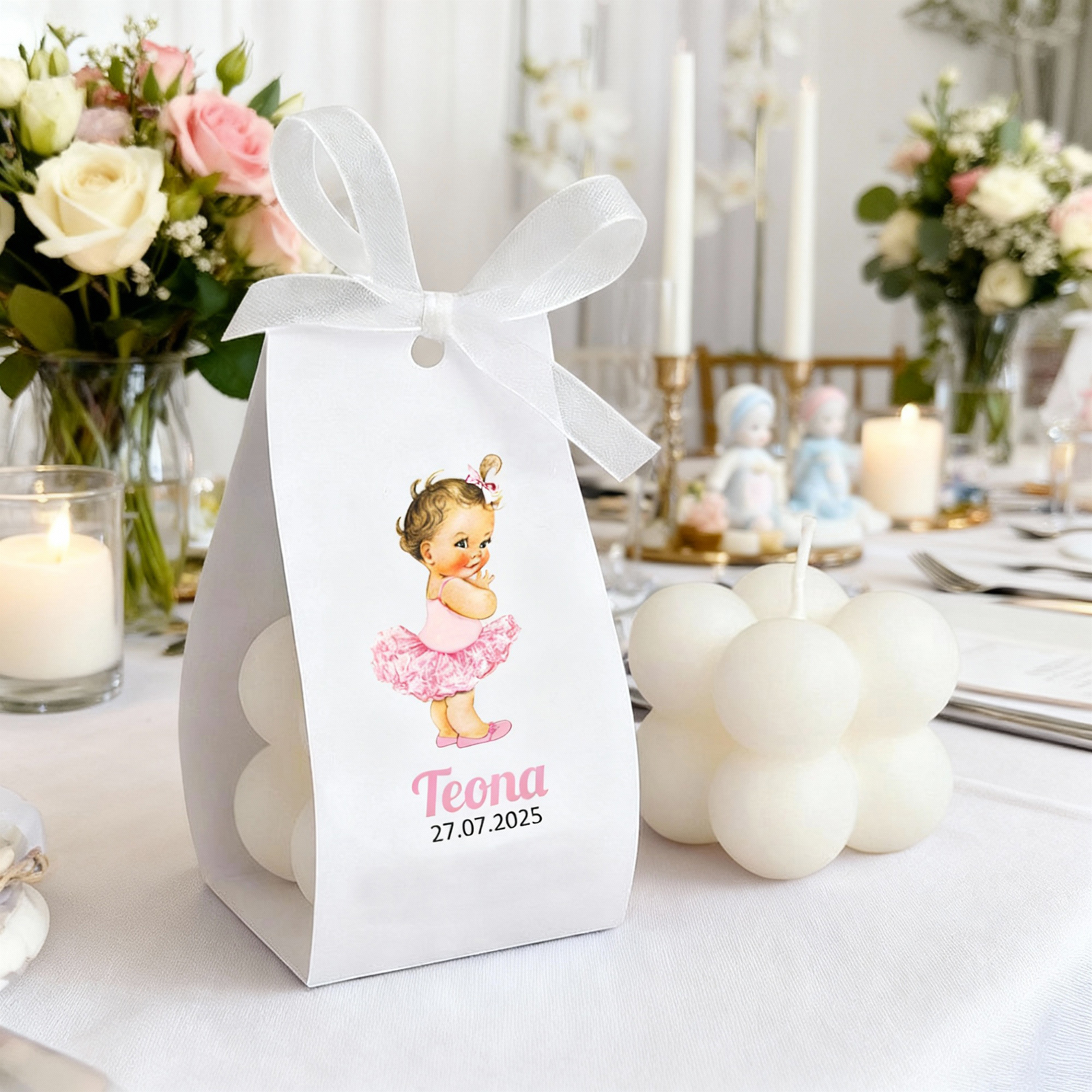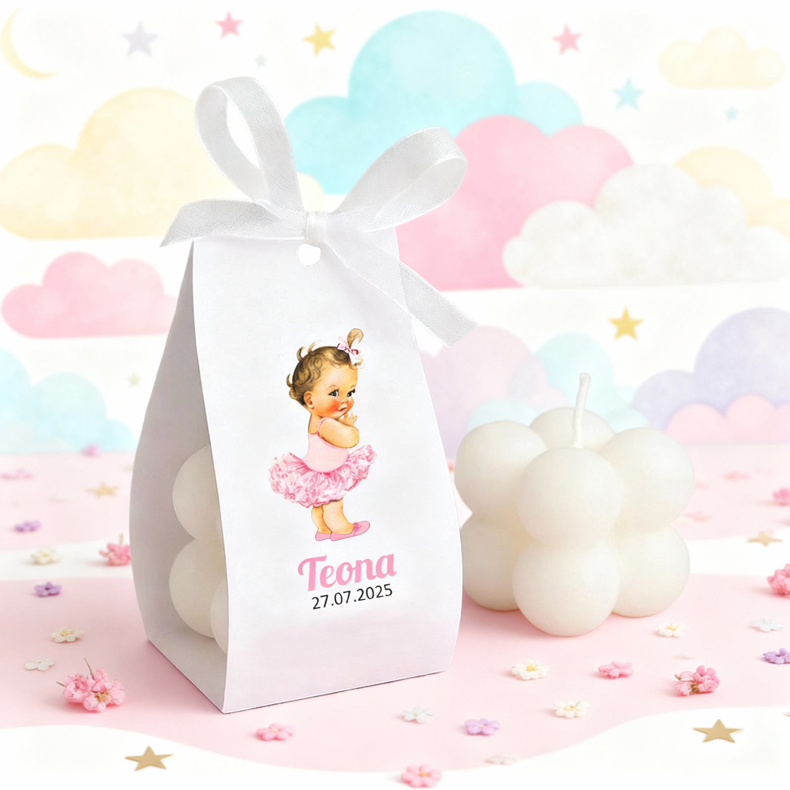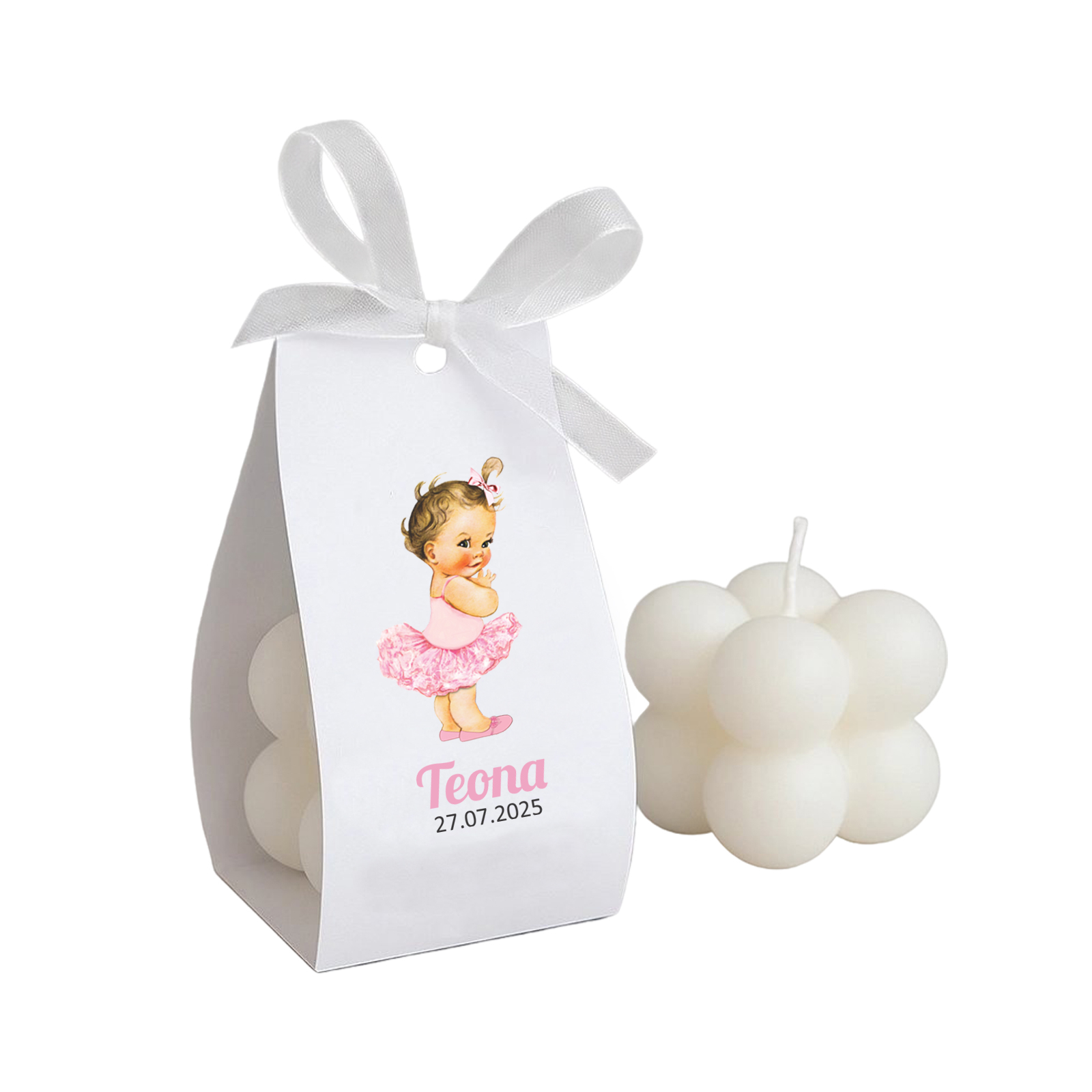 Lumanarea bubble din ceara, cu dimensiunea de 4x4 cm, adauga un plus de rafinament si modernitate, completand designul deosebit al figurinei. Pe marturie este ilustrata o balerina cu rochita tutu roz, simbol al gingasiei si al inocentei, oferind invitatiilor o amintire frumoasa si plina de emotie.